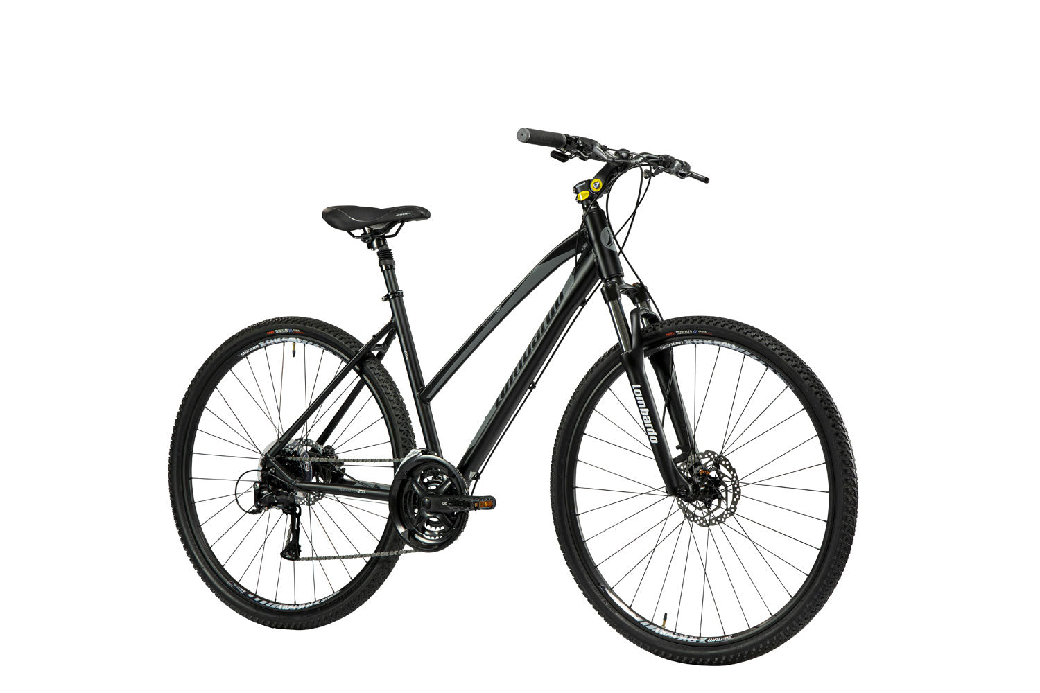 Modèle dame, modèle trekking avec cadre “courbé”, cadre 6061 alu, 24 vit. Shimano Acera STI, fourche télescopique, jantes renforcées noires avec 32 rayons, Shimano M315 freins à disque hydrauliques (160-160), tige de selle alu, potence AHead réglable, moyeux à blocage, pattes démontables, boitier de pédalier étanche.