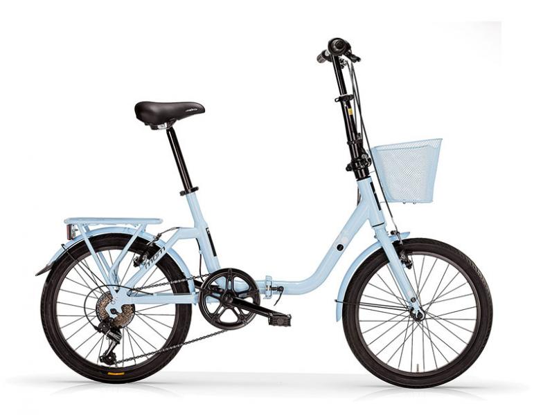 vélo pliant, cadre acier, 6 vit. Shimano Revoshift, V-brakes et leviers de frein alu, jantes alu, pédales réversibles, boitier de pédalier étanche, panier avant.